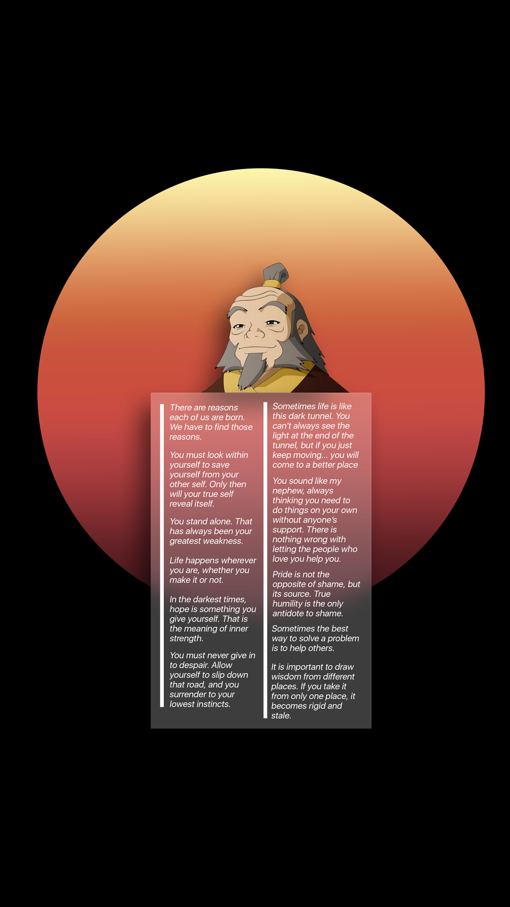 Uncle Iroh's most inspiring quotes from Avatar: The Last Airbender. Includes a vertical and horizontal 5K version of the wallpaper - can easily be adapted to work on on any vertical or horizontal screen.